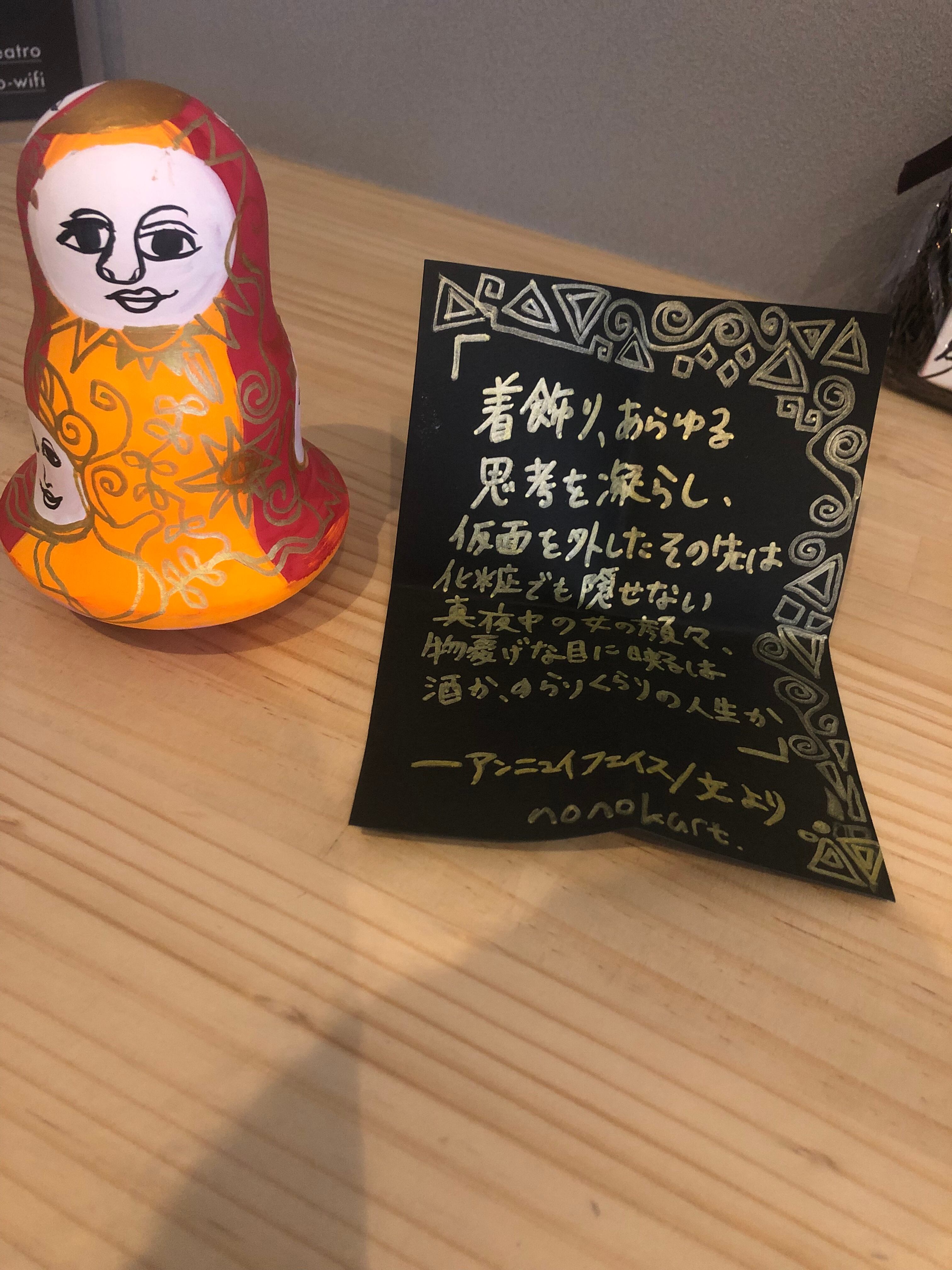 「 着飾り、思考を凝らし、仮面を外したその先は化粧でも隠せない真夜中の女の顔々、物憂げな目に映るは、退屈しのぎに飲む酒か、のらりくらりの人生か」